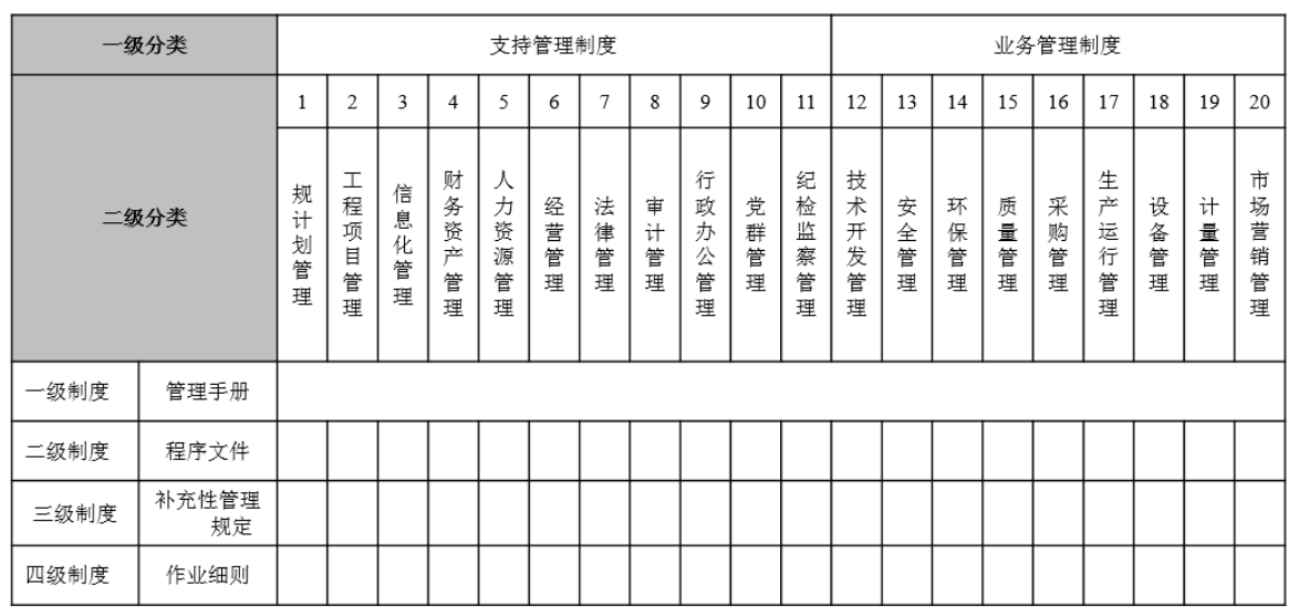 1、建立支撐戰(zhàn)略、符合企業(yè)運營管理特點的制度框架,確保制度建設(shè)“橫向到邊,縱向到底”,無盲區(qū)。