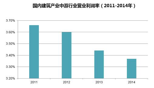 (3)從行業(yè)利潤率來看,建筑工程行業(yè)門檻低,是充分競爭行業(yè),企業(yè)分散,企業(yè)間競爭激烈,利潤率已非常低,近年來呈現(xiàn)曲折下降的態(tài)勢,2014年建筑業(yè)營業(yè)利潤率總體低于3.4%。。