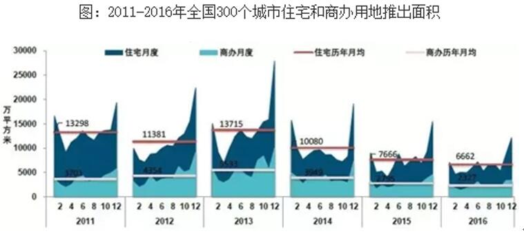 1、全國(guó)各類土地供需量仍保持低位。在全國(guó)去庫(kù)存政策的指導(dǎo)下,地方政府繼續(xù)減少土地推出量,2016年全國(guó)300個(gè)城市共推出各類用地18.2億平方米,同比下降11.0%,降幅較2015年收窄7.8個(gè)百分點(diǎn),整體仍處于較低水平。