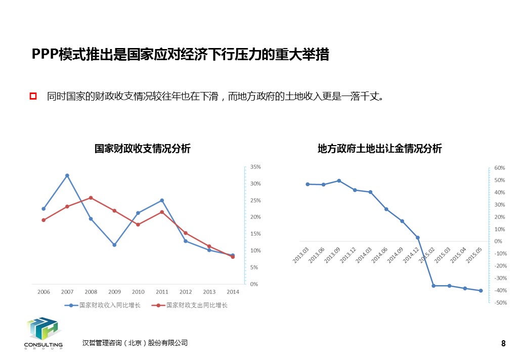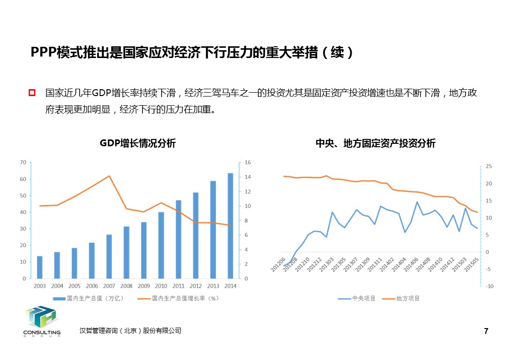 1、PPP模式推出是國家應(yīng)對經(jīng)濟下行壓力的重大舉措:國家近幾年GDP增長率持續(xù)下滑,經(jīng)濟三駕馬車之一的投資尤其是固定資產(chǎn)投資增速也是不斷下滑,地方政府表現(xiàn)更加明顯,經(jīng)濟下行的壓力在加重。