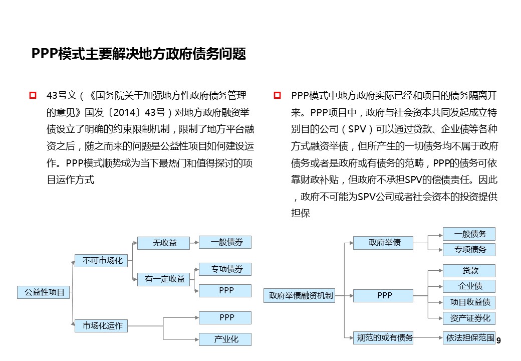 43號文(《國務(wù)院關(guān)于加強地方性政府債務(wù)管理的意見》國發(fā)〔2014〕43號)對地方政府融資舉債設(shè)立了明確的約束限制機制,限制了地方平臺融資之后,隨之而來的問題是公益性項目如何建設(shè)運作。PPP模式順勢成為當(dāng)下最熱門和值得探討的項目運作方式。