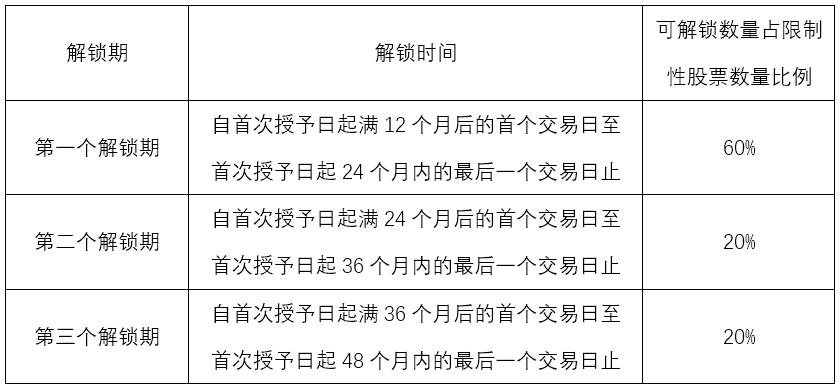 4、解鎖日:限制性股票激勵計劃的有效期為自限制性股票首次授予日起不超過五年。鎖定期內(nèi)激勵對象因獲授的限制性股票而取得的紅股、資本公積轉(zhuǎn)增股份、配股股份、增發(fā)中向原股東配售的股份同時鎖定,不得在二級市場出售或以其他方式轉(zhuǎn)讓,該部分股票的鎖定期與獲授的限制性股票鎖定期相同。解鎖期在首次授予日起滿12個月月后的未來36個月內(nèi)分三期解鎖(如表2-2所示)。