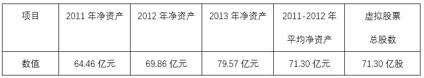 設(shè)定本方案實施當(dāng)年的1月1日為基準日。根據(jù)虛擬合并報表,以基準日之前的三年平均凈資產(chǎn)額,虛構(gòu)股票。如本方案于2014年正式實施,按照虛擬合并報表2011~2013年的平均凈資產(chǎn)額71.30億元,以每股凈資產(chǎn)1元折算,虛擬股票總股數(shù)共計71.30億股。虛擬股票總數(shù)的確定如表3-6所示: