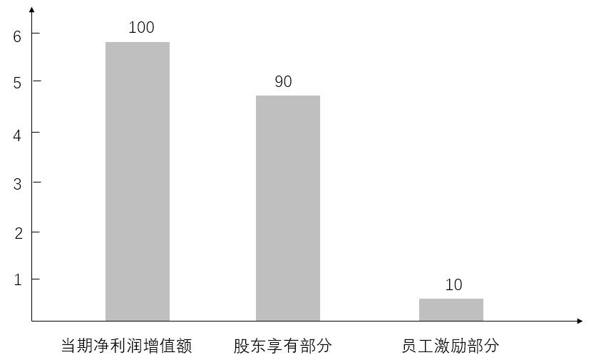 在例二中,當(dāng)期凈利潤20億元,每股凈利潤為0.2525元,超過標(biāo)桿線的增值部分為0.0769元。71.3億股總的增值額為5.48億元,其中用于激勵的為增值額的10%,其余增值額的90%歸屬于股東所有。圖示如圖3-1: