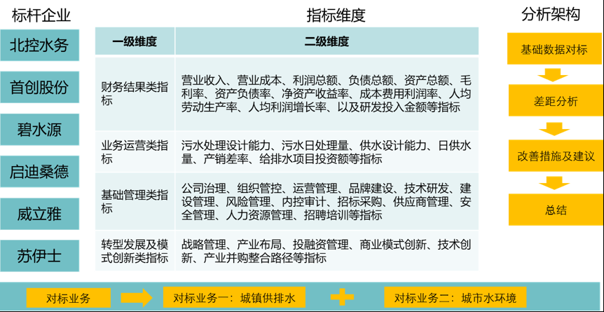 為實(shí)現(xiàn)客戶對(duì)標(biāo)需求,結(jié)合客戶在水務(wù)行業(yè)的戰(zhàn)略規(guī)劃,確定了對(duì)標(biāo)的業(yè)務(wù)類型。同時(shí),與客戶溝通標(biāo)桿企業(yè)選取原則,明確對(duì)標(biāo)的企業(yè)范圍。在此基礎(chǔ)上,從多維度、立體化的系統(tǒng)性思維出發(fā),設(shè)置一級(jí)指標(biāo)維度以及相應(yīng)的二級(jí)指標(biāo)維度,形成對(duì)標(biāo)的指標(biāo)框架。最后,搜集相關(guān)數(shù)據(jù),結(jié)合對(duì)標(biāo)分析架構(gòu),對(duì)各維度進(jìn)行細(xì)化分析。