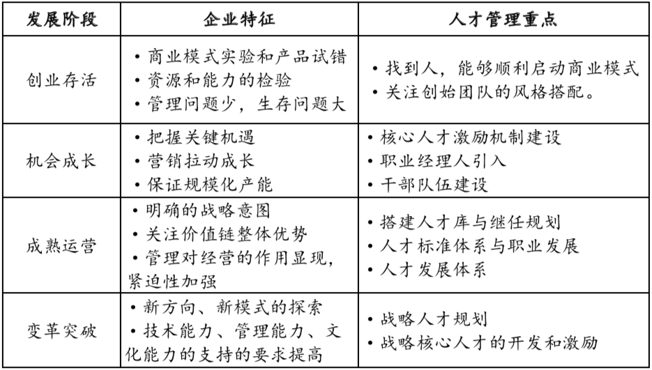 第一:保持與企業(yè)發(fā)展階段的適應性:企業(yè)不同的發(fā)展階段,經營的中心不一樣,相應人才管理所需要解決的核心問題也就不同,借用愛迪斯的企業(yè)生命周期理論,將衰退期理解為變革轉型期的基礎上,將各階段人才管理的重點如下: