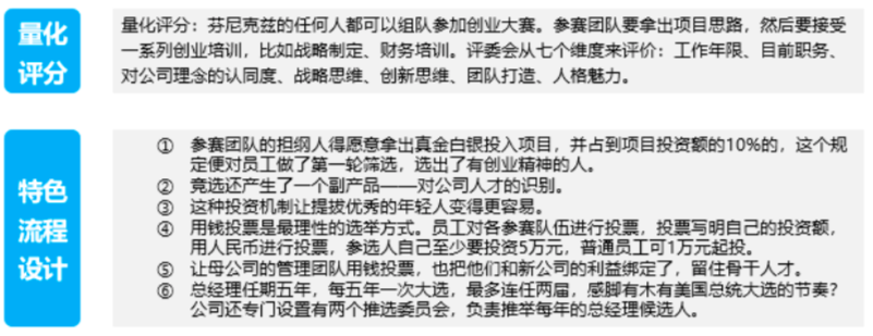 2、用錢投票,可杜絕人情關(guān)系,選出最好的創(chuàng)業(yè)項目和團(tuán)隊;人人平等,每位員工都可報名參加創(chuàng)業(yè)大賽,打破新員工職位無法超過老員工的企業(yè)倫理困境。