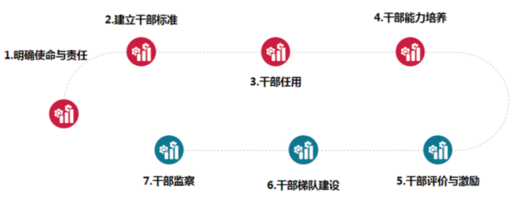 華為的干部管理七步曲,包括:明確使命與責任;建立干部標準;干部任用程序;干部能力發(fā)展;干部評價與激勵;干部梯隊建設和后備干部培養(yǎng);干部監(jiān)察。