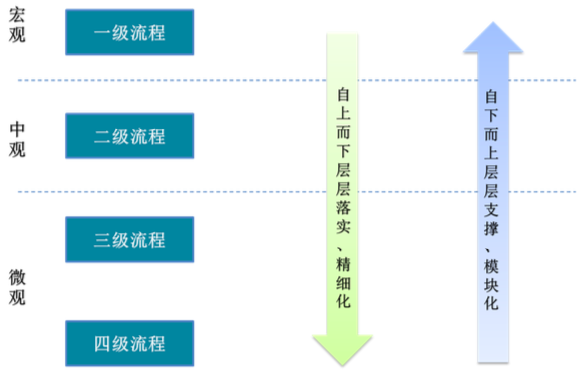 企業(yè)管理必然依托于一定的層級關(guān)系開展,下圖直觀展示各級流程間關(guān)系,從一級流程到四級流程,是自上而下的層層分解落實、精細化的過程,從四級流程到一級流程是自下而上層層支撐、模塊化的過程。它們系統(tǒng)構(gòu)成了企業(yè)管理不同層級的管理單元。