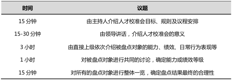 人才校準(zhǔn)會的主要流程為由主持人引導(dǎo)這個過程,由直接上級對被盤點(diǎn)隊(duì)對象進(jìn)行討論。