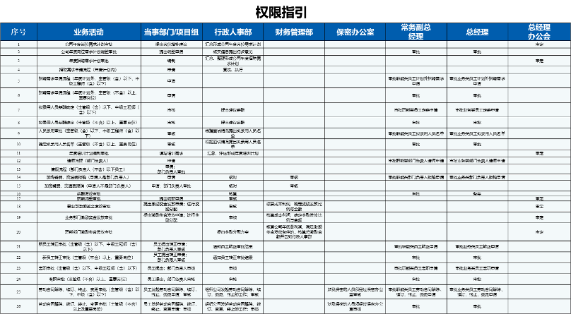 基于組織功能分析及前期對公司的了解,建立核決事項清單,明確各關(guān)鍵事項在部門之間的權(quán)限分配。核決事項清單對不同管控條線下的“關(guān)鍵權(quán)限事項”進(jìn)行梳理,厘清其權(quán)限邊界;部分關(guān)鍵權(quán)限事項從不同的角度來看,可能分屬于不同的管控層面或管控條線(如采購管理中采購付款也屬于財務(wù)管理),并不影響權(quán)限事項的決策運行:在實際運作中,該權(quán)限事項如果同時涉及多條權(quán)限,則必須按照滿足所有條線的權(quán)限規(guī)則來運行,即遵行“從嚴(yán)準(zhǔn)則”。