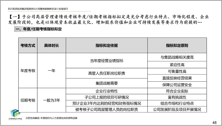 1、優(yōu)化集團(tuán)和子公司經(jīng)營業(yè)績考核辦法。根據(jù)集團(tuán)戰(zhàn)略目標(biāo)和子公司的功能定位、業(yè)務(wù)特點(diǎn),集團(tuán)總部實(shí)行年度考核,所屬子公司實(shí)行年度考核與任期考核相結(jié)合的方式,遵循戰(zhàn)略導(dǎo)向、團(tuán)隊(duì)導(dǎo)向、客觀公正、分類考核的原則,制定各部門考核指標(biāo)、考核程序、考核計(jì)分辦法,形成經(jīng)營業(yè)績考核辦法,提高激勵作用,為實(shí)現(xiàn)集團(tuán)戰(zhàn)略目標(biāo)夯實(shí)基礎(chǔ)。