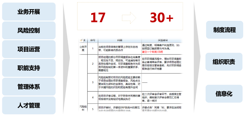 項目組從業(yè)務(wù)開展、風(fēng)險控制、項目運營、職能支持、管理體系、人才管理等維度開展評估,提出問題優(yōu)化建議。