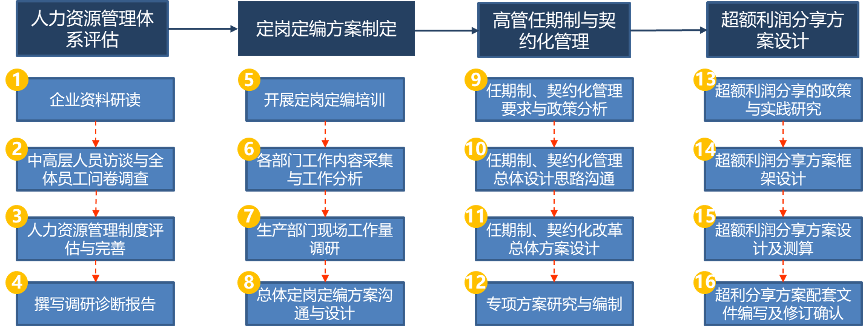 整體解決方案分為四個(gè)階段:人力資源管理體系評(píng)估、定崗定編方案制定、高管任期制與契約化管理、超額利潤分享方案設(shè)計(jì)。如下圖:
