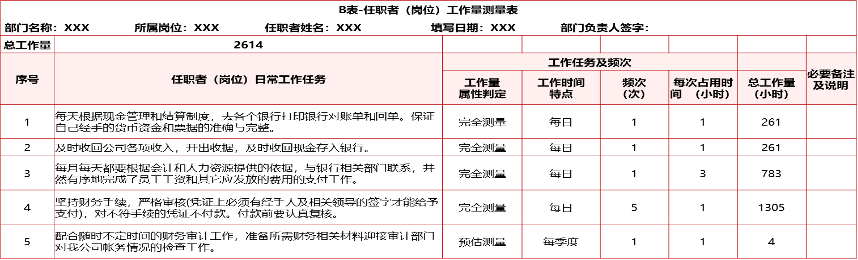 (3)工作量測(cè)量法:是通過對(duì)員工的實(shí)際工作時(shí)間進(jìn)行統(tǒng)計(jì)分析,計(jì)算部門編制彈性系數(shù)及各員工工作負(fù)荷度,以衡定部門及崗位員工編制的合理性。如下表: