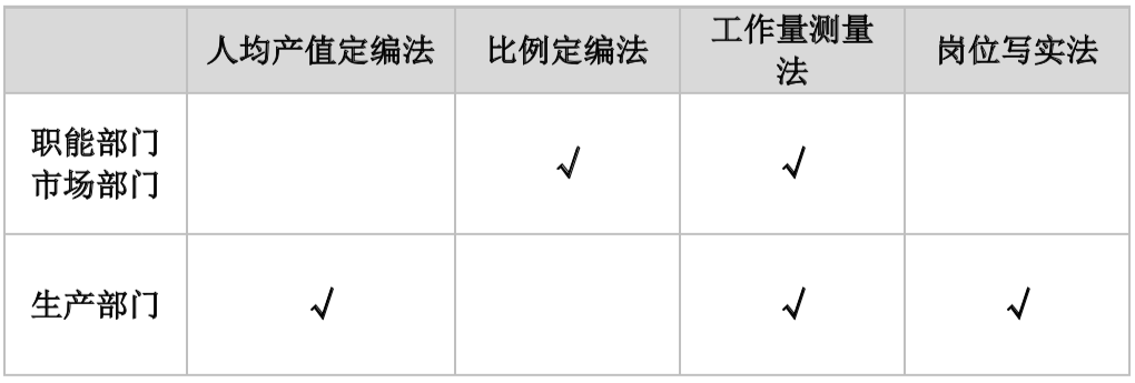 (2)比例定編法:是指通過設(shè)定不同類型人員的比例,在總量確定的基礎(chǔ)上,核定各類人員數(shù)量的方法。計(jì)算公式:部門/類型人員數(shù)量=該部門/類型人員比例×企業(yè)員工總數(shù)。其中:不同部門、類型人員比例通常運(yùn)用行業(yè)對(duì)標(biāo)、歷史數(shù)據(jù)分析、工作量測(cè)量等方式確定;