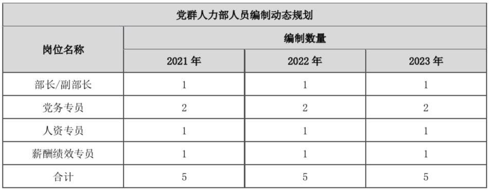 (1)職能、市場類部門定崗定編方案:通過《定崗定編職能套表》的履職情況評(píng)估、DPE崗位分析與工作量測(cè)量,并結(jié)合實(shí)際情況(戰(zhàn)略目標(biāo)、重點(diǎn)任務(wù)、人員能力等),對(duì)各部門職責(zé)進(jìn)行梳理,對(duì)各崗位進(jìn)行撤銷、合并、拆分、增設(shè)或職責(zé)調(diào)整,并對(duì)未來兩年(2022年、2023年)的編制提出建議,如下表: