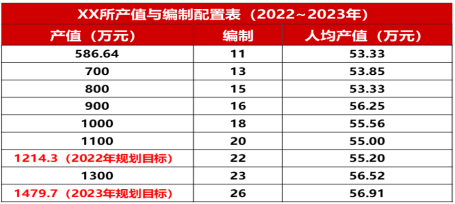 (3)生產(chǎn)部門數(shù)據(jù)收集:收集各生產(chǎn)部門近四年的人員數(shù)量、部門產(chǎn)值、合同金額等歷史數(shù)據(jù),并通過公司“十四五”戰(zhàn)略規(guī)劃與經(jīng)營發(fā)展部提供的數(shù)據(jù)測(cè)算,確定各生產(chǎn)部門在2022年與2023年的未來產(chǎn)值目標(biāo)。