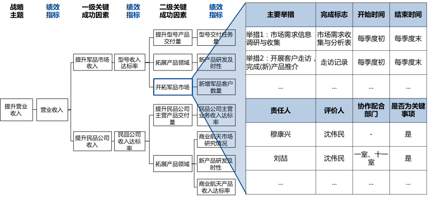 通過戰(zhàn)略解碼會將戰(zhàn)略主題層層分解,形成能夠促進戰(zhàn)略目標(biāo)實現(xiàn)的、可落地的關(guān)鍵成功因素,并對應(yīng)績效指標(biāo),確定主責(zé)部門。