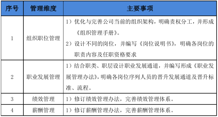 根據(jù)調(diào)研,本次績效薪酬體系優(yōu)化工作主要集中在組織職位體系梳理、職業(yè)發(fā)展通道設計、薪酬結構優(yōu)化、考核模式與指標體系優(yōu)化等方面。
