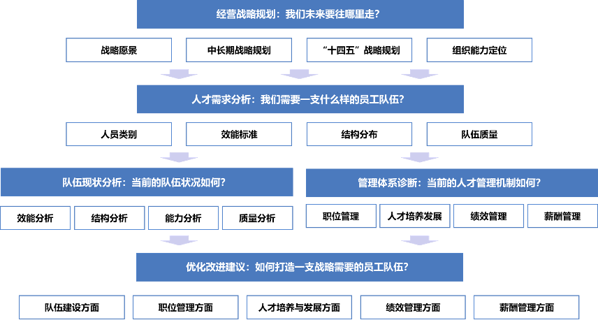 以人才隊(duì)伍建設(shè)為主線,理順經(jīng)營(yíng)戰(zhàn)略規(guī)劃,明確人才隊(duì)伍建設(shè)目標(biāo),盤點(diǎn)人才現(xiàn)狀,診斷管理體系,并提出人才隊(duì)伍建設(shè)舉措。