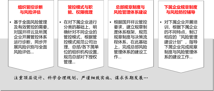 最后,在總部管控模式、制度體系、風險管理體系建設完善的基礎上,對下屬企業(yè)開展培訓,輔導下屬企業(yè)完成相應的制度建設與風險管理體系建設工作。