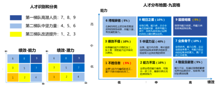 人才盤點(diǎn)的重要輸出成果人才分布地圖-九宮格,通過(guò)績(jī)效與能力、能力與潛力兩個(gè)維度,可以把人員劃分到九個(gè)不同的位置中,在后續(xù)的人才管理中會(huì)針對(duì)不同類型人才給予不同的管理策略,從而更精準(zhǔn)、有效地配置資源。