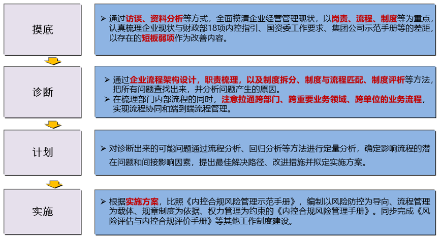 以集團公司模板和示范手冊為指導(dǎo),依托本企業(yè)現(xiàn)有規(guī)章制度,通過摸底、診斷、計劃、實施四個環(huán)節(jié),建立健全內(nèi)控合規(guī)風(fēng)險管理體系,并以管理制度和業(yè)務(wù)流程此為抓手,實施一體化建設(shè)。項目解決方案如下圖所示: