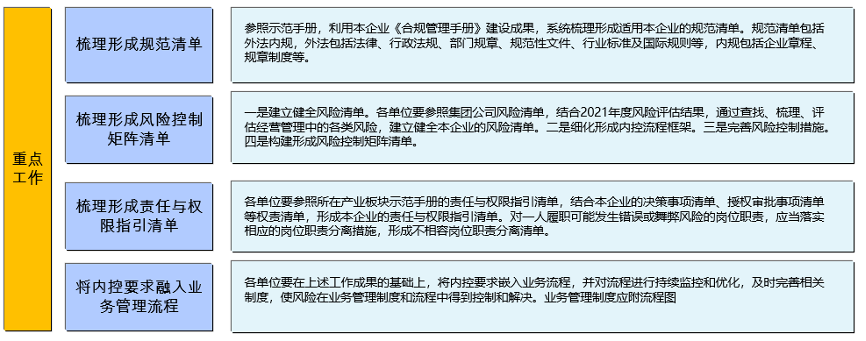 2.編制《內(nèi)控合規(guī)風(fēng)險管理手冊》,形成以風(fēng)險管控為導(dǎo)向、規(guī)章制度為依據(jù)、流程管理為載體、權(quán)責(zé)管理為約束的《內(nèi)控合規(guī)風(fēng)險管理手冊》,具體包括“三單一流程”,即:規(guī)范清單、風(fēng)險控制矩陣清單、責(zé)任與權(quán)限指引清單以及各業(yè)務(wù)管理流程。全面反映風(fēng)險點、控制點、控制措施、合規(guī)審查要點、控制目標(biāo)、輸出成果、信息系統(tǒng)載體、責(zé)任部門、制度依據(jù)等管理要素。提升企業(yè)標(biāo)準(zhǔn)化管理水平。