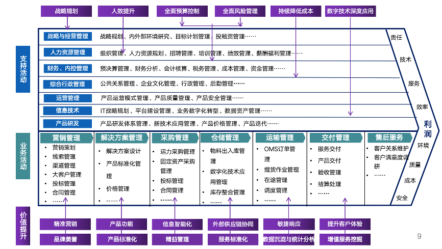 企業(yè)價值鏈梳理是管理體系建設(shè)的重要依據(jù),通過將企業(yè)創(chuàng)造價值的活動拆分,識別并強化能夠為企業(yè)帶來競爭優(yōu)勢的戰(zhàn)略活動,建立企業(yè)核心能力,以此來規(guī)劃企業(yè)管理體系的總框架。