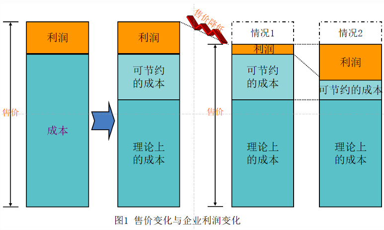 以利潤為中心,當(dāng)市場售價降低時,成本也必須降低,以便維持目標(biāo)利潤的經(jīng)營思想稱之為利潤主義(圖1中的情況2)。即成本=售價-利潤。現(xiàn)今市場競爭日益激烈,供應(yīng)大于需求,也就是買方市場,企業(yè)要想獲得更大的利潤,就必須努力降低成本。