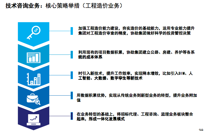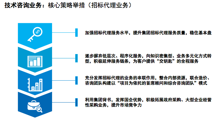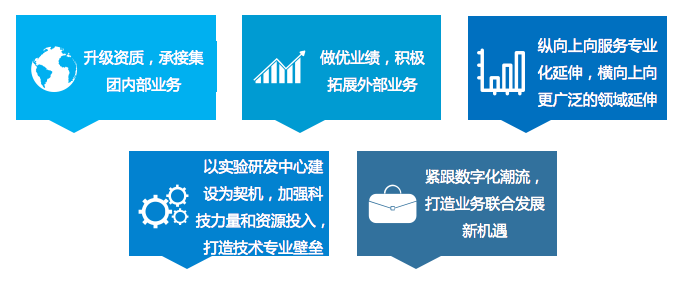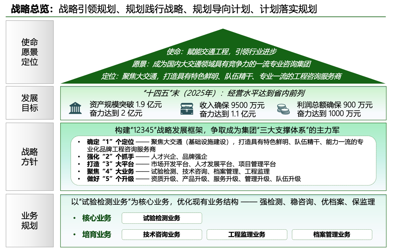 項目組通過對試驗檢測、工程咨詢、工程監(jiān)理、檔案管理四大業(yè)務(wù)領(lǐng)域深入分析和研究,結(jié)合工程咨詢業(yè)務(wù)現(xiàn)狀及集團(tuán)內(nèi)部資源狀況,對各項業(yè)務(wù)提出明確的功能定位、發(fā)展目標(biāo)及發(fā)展路徑,解決公司各項業(yè)務(wù)的總體定位和布局,以及“十四五”未來2年的增長路徑。