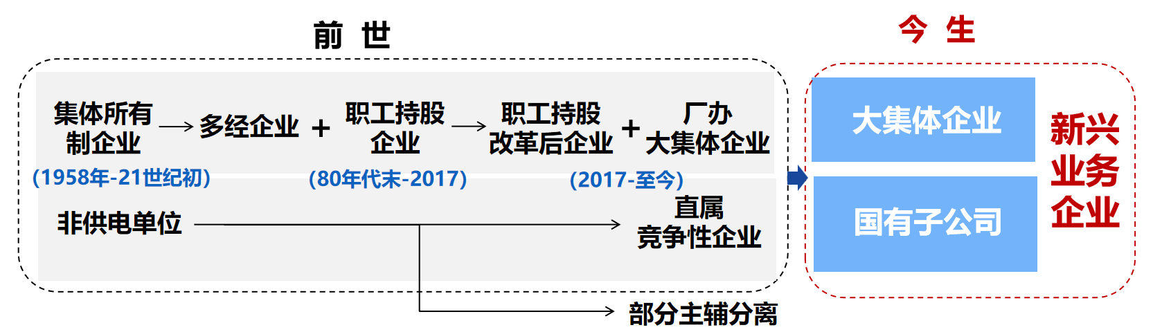 在社會(huì)經(jīng)濟(jì)發(fā)展和國企改革大環(huán)境下,電網(wǎng)公司大集體企業(yè)的“前世和今生”: