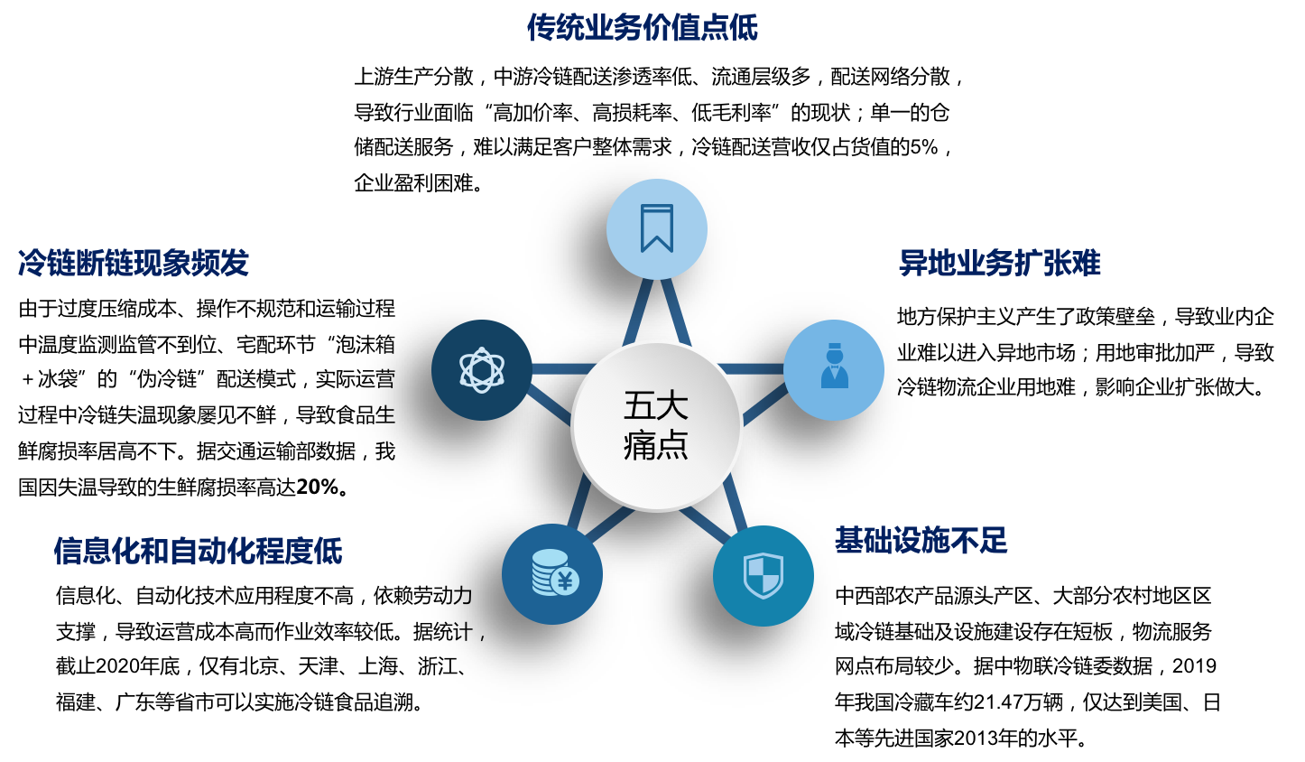 目前行業(yè)存在傳統(tǒng)業(yè)務價值點低、異地業(yè)務擴張難、基礎設施不足、信息化和自動化程度低、冷鏈斷鏈現(xiàn)象頻發(fā)等五大痛點。