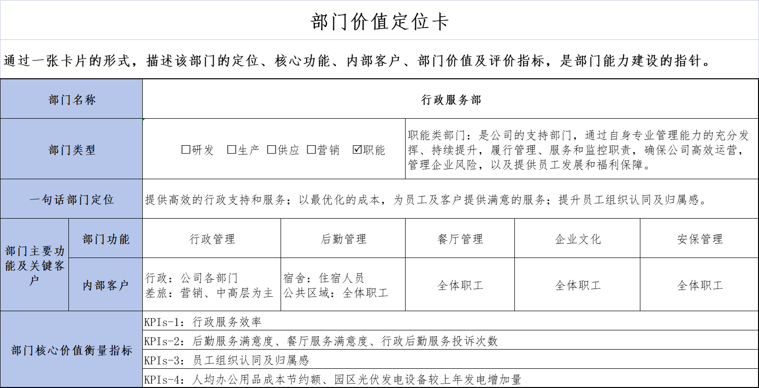 1、建立部門價(jià)值管理體系,重點(diǎn)是職能部門的價(jià)值定位和價(jià)值評(píng)價(jià),解決職能部門有效評(píng)價(jià)的問題。