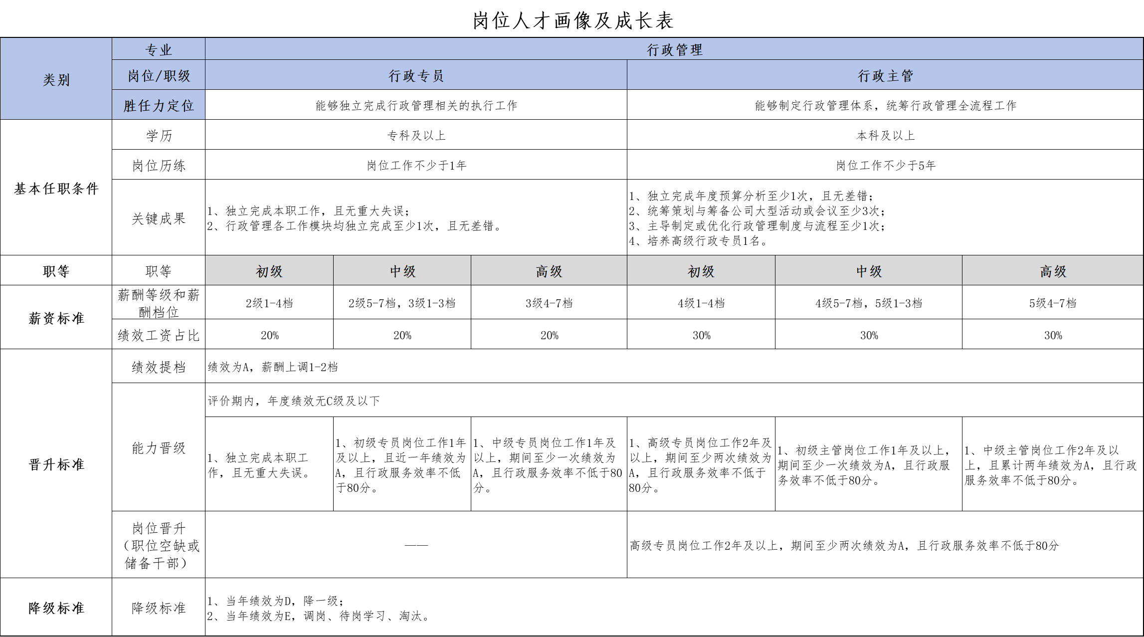 2、設(shè)計(jì)開發(fā)《員工畫像及成長(zhǎng)表》各對(duì)崗位不同層級(jí)的角色定位、晉升和降級(jí)標(biāo)準(zhǔn)、考核指標(biāo)、薪酬待遇范圍等,方案簡(jiǎn)潔清晰,“一站式”解決部門對(duì)員工評(píng)價(jià)標(biāo)準(zhǔn)和成長(zhǎng)激勵(lì)的問題。