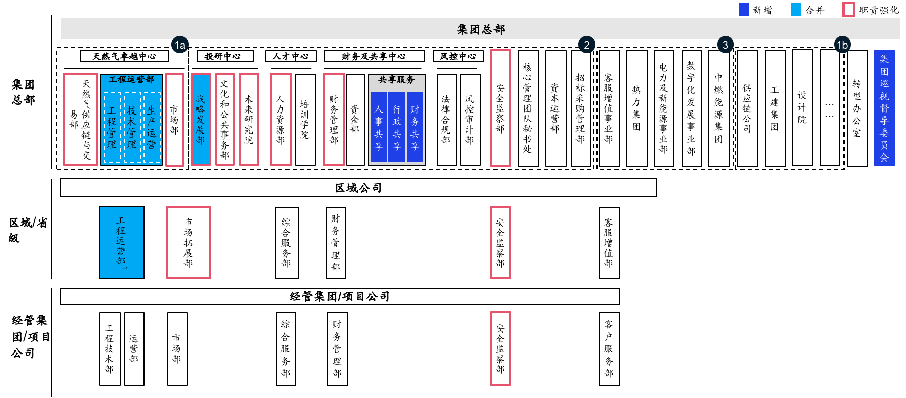 2021年11月起,公司聘請麥肯錫咨詢公司協(xié)助完成了公司管理變革方案的設(shè)計,重點在“組織架構(gòu)和職能優(yōu)化、分級授權(quán)和決策流程優(yōu)化、考核激勵機制優(yōu)化”方面。本次方案提出了“精簡總部、做實區(qū)域公司和新業(yè)務(wù)集團(一級組織)”的主張,在項目公司之上,有條件地增設(shè)了經(jīng)營集團,以縮小管理幅度、加強管控力度,形成了事實上的四級管控;同時,通過“兩級閉環(huán)”的設(shè)計邏輯,實現(xiàn)了管理權(quán)限的層層釋放,實現(xiàn)了部分核心職責的下移和前移。目前,上述管理變革方案已設(shè)計完成,部分已推動落地。