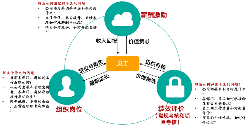 基于以上需求,本次咨詢項(xiàng)目,應(yīng)該從組織崗位、薪酬激勵(lì)、績(jī)效評(píng)價(jià)三個(gè)主線(如下圖所示),開展系統(tǒng)性的管理方案設(shè)計(jì),從深層次解決當(dāng)前問題,達(dá)到預(yù)期改革效果。