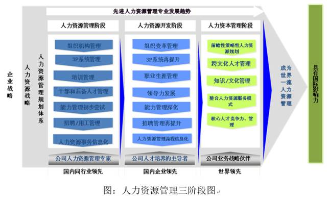 《企業(yè)人力資源管理三階段模型》將企業(yè)的人力資源管理水平劃分為為三個階段,即:人力資源管理階段、人力資源開發(fā)階段和人力資本管理階段,如下圖所示: