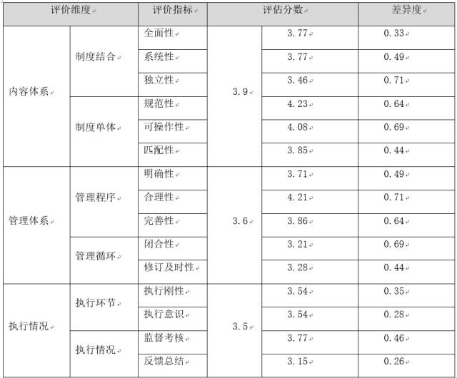 單項指標得分總和的平均數(shù)作為最終得分。分值越高,說明對現(xiàn)有制度體系的總體認可度越高。單項指標的分值方差代表評價差異度,差異度越高,表明內(nèi)部對同一指標的意見差異越大。超過一定偏差,需要重新進行打分。