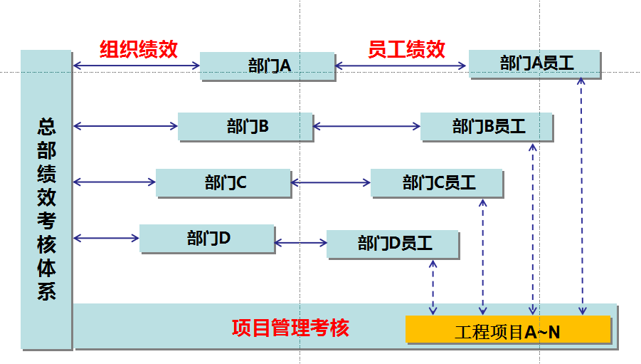 根據(jù)診斷中發(fā)現(xiàn)的問(wèn)題,我們把績(jī)效考核分為三個(gè)層次,分別是部門級(jí)考核、員工級(jí)考核和項(xiàng)目管理考核;部門考核基于公司的戰(zhàn)略目標(biāo),層層分解,直到分解到每個(gè)部門需承擔(dān)的責(zé)任,抽象為績(jī)效考核指標(biāo);員工考核基于公司分解到部門的指標(biāo)承接及本崗位職責(zé)的指標(biāo)提取。項(xiàng)目管理考核按項(xiàng)目管理四維度進(jìn)行展開(kāi),充分體現(xiàn)項(xiàng)目管理特點(diǎn)及重要性。