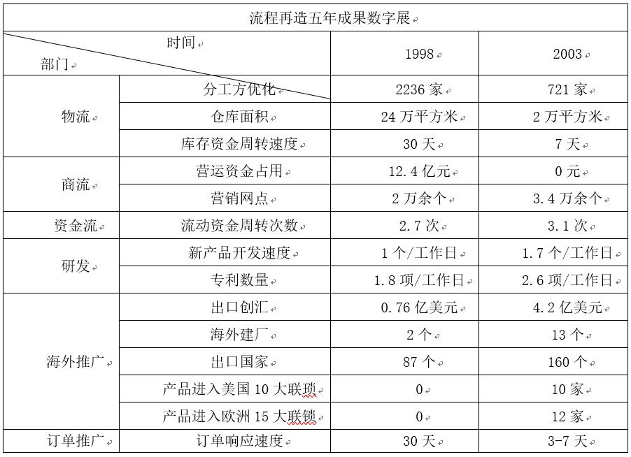 海爾集團(tuán)業(yè)務(wù)流程再造的效果如下表所示。從圖表中可以看到,經(jīng)過(guò)流程再造,海爾集團(tuán)在物流、商流、資金流方面都取得了巨大進(jìn)展,在研發(fā)、海外推廣、訂單推廣方面也取得了不菲的成績(jī)。