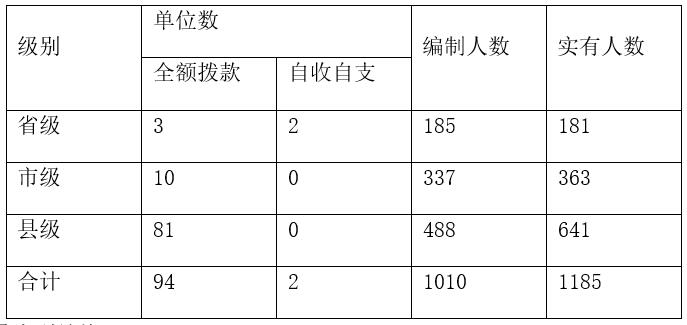 藥監(jiān)系統包含了省屬、市屬和縣屬事業(yè)單位。省屬事業(yè)單位共有5個,從經費來源看,其中3個為全額撥款事業(yè)單位,2個為自收自支事業(yè)單位;市屬事業(yè)單位10個,縣屬事業(yè)單位81個,全部為全額撥款事業(yè)單位。如表所示: