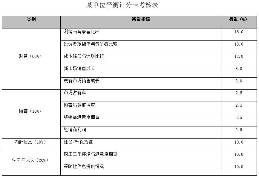 平衡計分卡是卡普蘭和諾頓在總結(jié)了十二家大型單位的業(yè)績評價體系的成功經(jīng)驗的基礎(chǔ)上提出的。平衡計分卡是一種戰(zhàn)略性人力資源管理思想和指導(dǎo)方法。平衡計分卡的倡導(dǎo)者認(rèn)為在制定單位發(fā)展戰(zhàn)略目標(biāo)時,不能只考慮財務(wù)指標(biāo),而應(yīng)該考慮支撐單位財務(wù)指標(biāo)實現(xiàn)的其他方面:關(guān)注客戶、業(yè)務(wù)流程、學(xué)習(xí)與成長等。由此,平衡計分卡考核指標(biāo)可以從多個維度構(gòu)建,但是較為普遍的是從財務(wù)維度、客戶維度、內(nèi)部流程維度、學(xué)習(xí)和創(chuàng)新維度進行考慮。