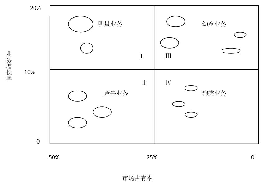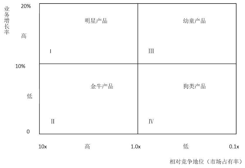 波士頓矩陣(BCG矩陣)是由美國波士頓咨詢公司率先提出的、對企業(yè)當前的業(yè)務組合進行分析、評價的戰(zhàn)略管理工具。它把公司經(jīng)營的全部產(chǎn)品和服務的組合作為一個總體來看待,故也稱“統(tǒng)籌分析法”。這種方法假定企業(yè)由兩個以上的經(jīng)營單位組成,每個單位的產(chǎn)品有明顯的差異并具有不同的細分市場。在擬定每個產(chǎn)品的發(fā)展戰(zhàn)略時,主要考慮的是它的相對競爭地位(市場占有率)和業(yè)務增長率。以前者為橫坐標,后者為縱坐標,分為四個象限,企業(yè)各經(jīng)營單位的產(chǎn)品按其市場占有率和業(yè)務增長率高低填入相應的位置,形成矩陣。