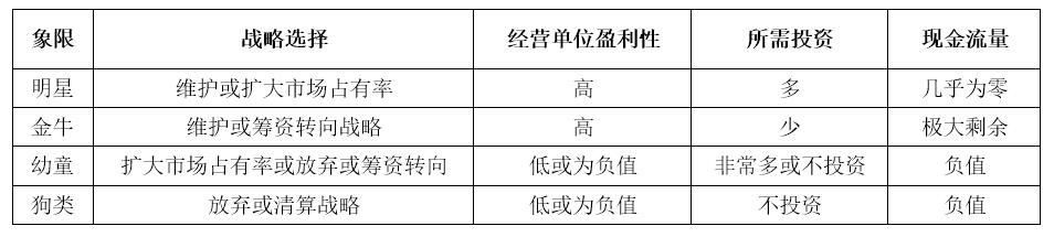 表1 : BCG矩陣對應象限業(yè)務戰(zhàn)略選擇